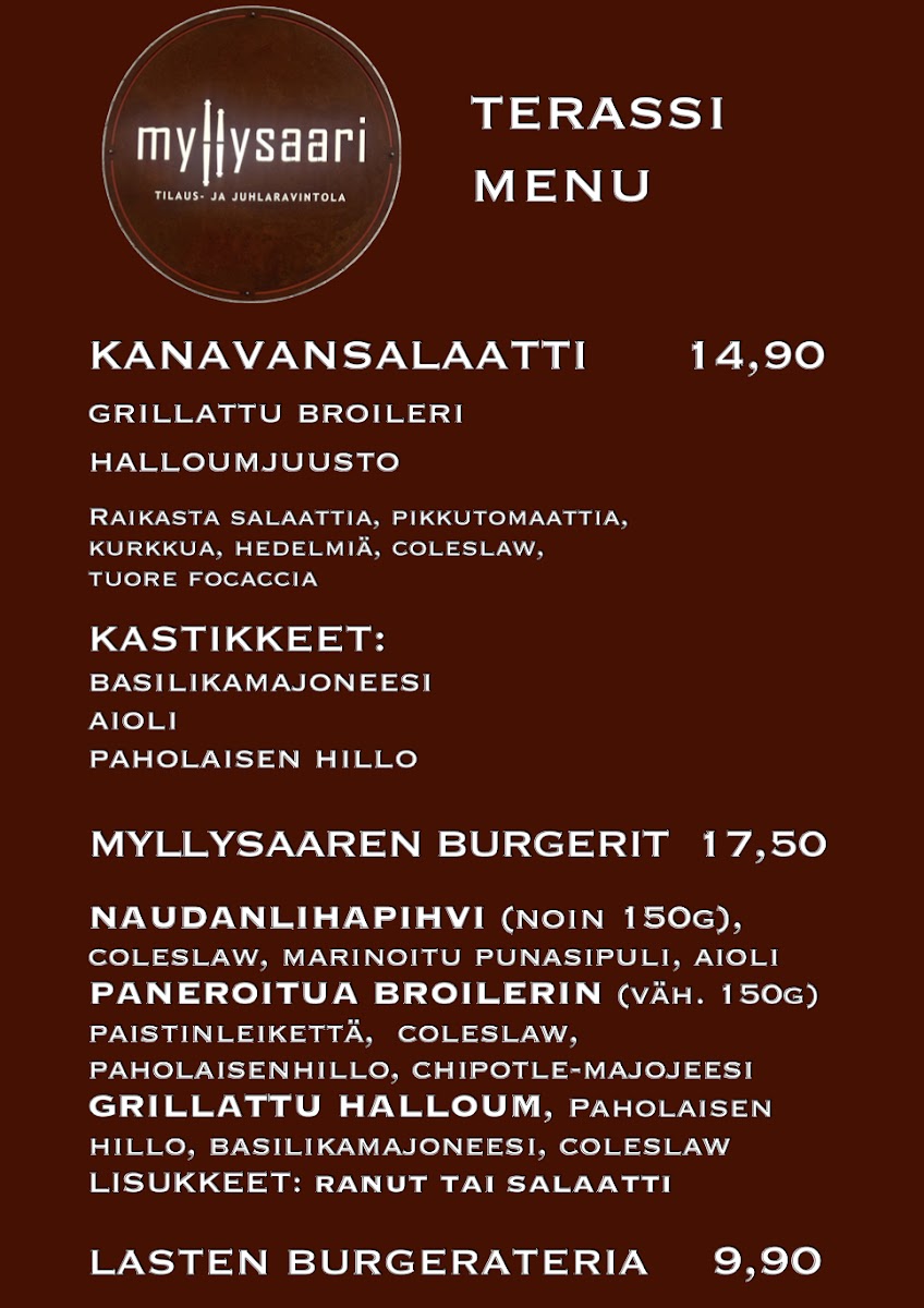 Welcome to Tilaus- ja Juhlaravintola Myllysaari, located in the picturesque setting of Kanavanranta, Valkeakoski. This charming restaurant offers a delightful menu that caters to both casual diners and special occasions. The highlights include the refreshing Kanavansalaatti, a salad bursting with freshness, and the irresistible Grillattu Broileri and Halloumjuusto, both priced at €14.90.